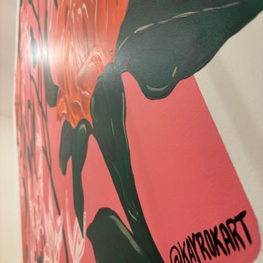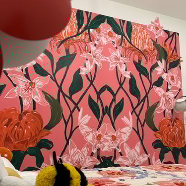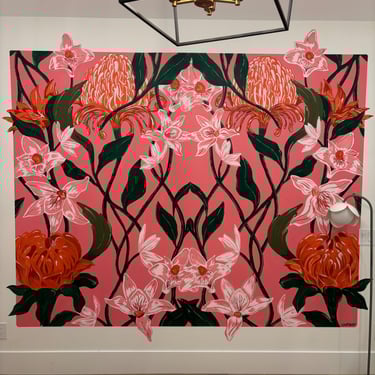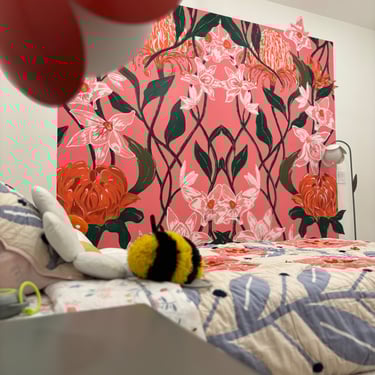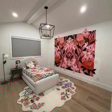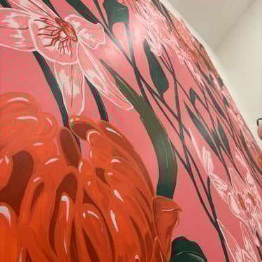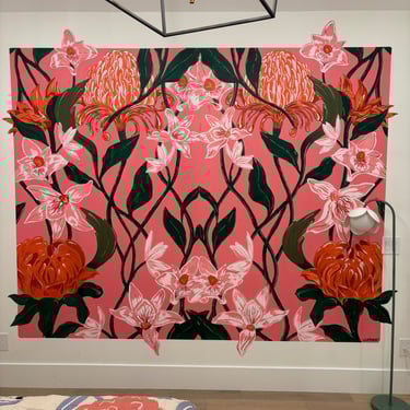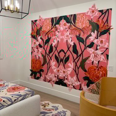 This commissioned piece, titled The Flower Girl Bedroom Mural, was designed to transform a young girl’s bedroom into a vibrant, imaginative retreat. The mural features a bold composition of oversized florals in vivid pinks, reds, and greens, set against a striking blush-toned background. The dynamic arrangement of lilies and protea blooms creates both movement and warmth, striking a balance between playful energy and artistic sophistication. Positioned as the focal point of the room, the mural complements the whimsical décor. From the floral-patterned bedding to the organic-shaped rug, while adding a sense of depth and personality to the space. Thoughtfully scaled to engage a child’s imagination without overwhelming the room, this artwork was created to inspire joy, creativity, and a lasting connection with the beauty of nature. Blending artistry with functionality, The Flower Girl Bedroom Mural serves as both an expressive statement piece and a cherished backdrop to the everyday moments of childhood.