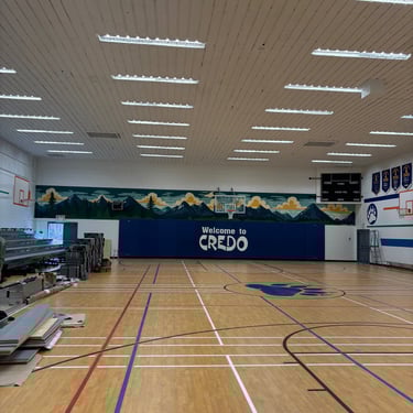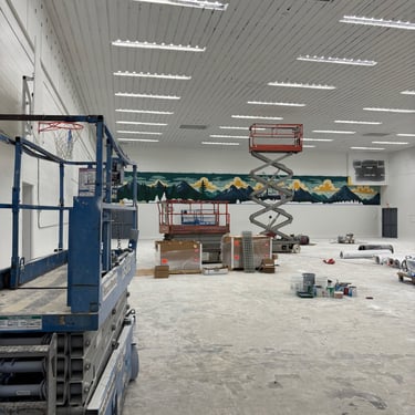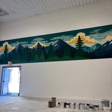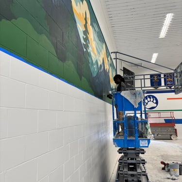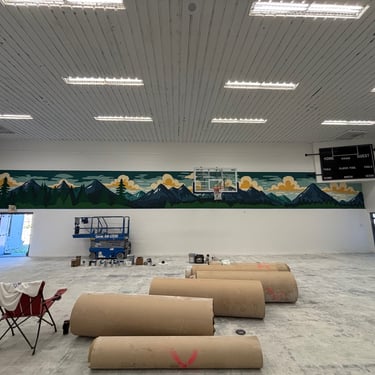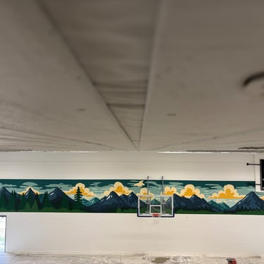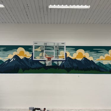 Commissioned for a high school gymnasium, The Mountain Horizon Mural was designed to bring energy, inspiration, and a sense of place to the athletic environment. Spanning the length of the court, the artwork captures a bold mountain landscape at sunrise, with layered peaks, evergreen silhouettes, and radiant skies unfolding in dynamic contrast. The mural’s expansive scale transforms the gym into more than just a space for sports—it becomes a backdrop that reflects resilience, determination, and natural beauty. The crisp, graphic style ensures visibility from anywhere in the gym, while the vibrant palette of blues, greens, and golds energizes the space and enhances school spirit. Strategically positioned above the basketball hoops and scoreboard, the mural frames athletic activity with a sense of grandeur and aspiration, encouraging students to push beyond limits and rise to new heights.